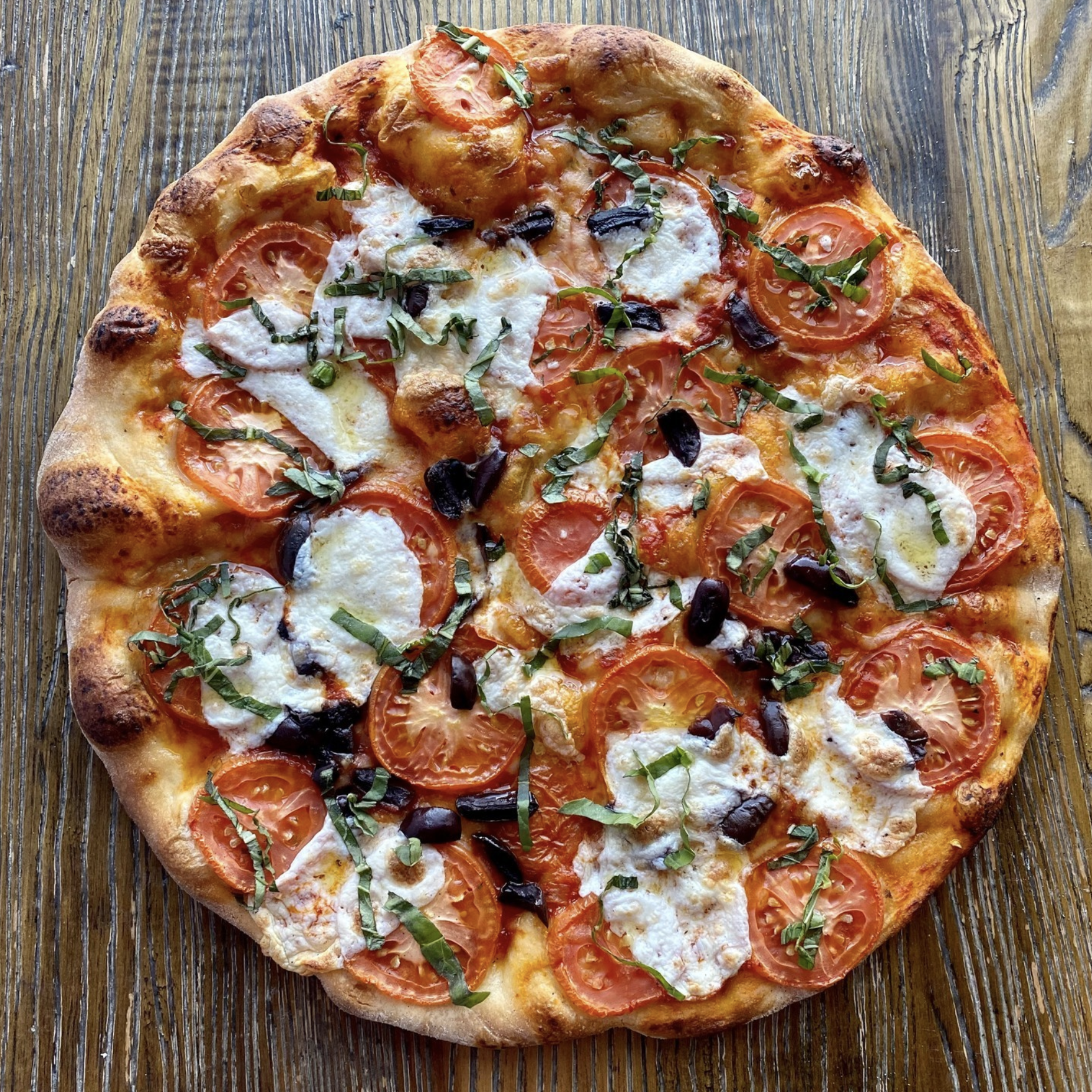 Our fancy cheese pie with roasted tomato, mozzarella, fresh basil and balsamic reduction.